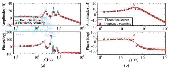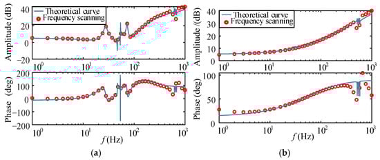 It can be seen from Figure 5 that the impedance models of the controllable nonlinear load are basically consistent with the scanning results. Therefore, it can be considered that the impedance models shown in Equations (14) and (15) are correct. Similarly, frequency scanning is performed on the parallel subsystem, and the results are shown in Figure 6, verifying the correctness of Zs(s) of the parallel subsystem.