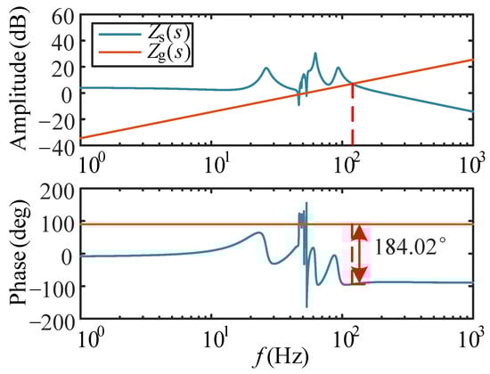 Considering the worst situation for system stability, the grid impedance is represented by sLg, where Lg is the equivalent inductance of the grid. To simulate a weak grid, Lg is taken as 0.003 H. Draw the impedance characteristics of the parallel subsystem and the grid in the Bode diagram, as shown in Figure 7.