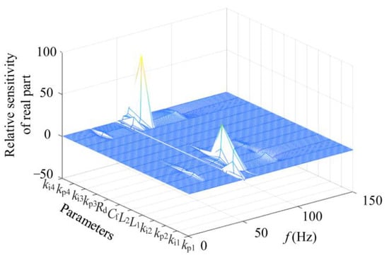 Impedance sensitivity analysis was performed for the system parameters in Table 1 and Table 2. The analyzed parameters encompass kp1 and ki1 of the PLL in the PV generation unit, kp2 and ki2 of the current inner loop, kp3 and ki3 of the PLL in the controllable nonlinear load, kp4 and ki4 of DC current control, and L1, L2, Cf, and Rd of the LCL-type filter. Figure 8 and Figure 9 illustrate the relative sensitivities of the real and imaginary parts of each parameter across the frequency range of 0–150 Hz.