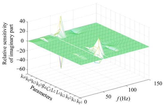 It can be found from Figure 8 that the parameters with higher absolute values of relative sensitivities of the real part are kp4, kp2, and ki2 in the range of 80–150 Hz. Similarly, the parameters with higher absolute values of relative sensitivities of the imaginary part are kp4 and kp2, as illustrated in Figure 9. Therefore, it is concluded that the changes in kp4 and kp2 in the range of 80–150 Hz have a significant impact on the impedance of the system, and kp4 and kp2 are the key parameters affecting system stability.