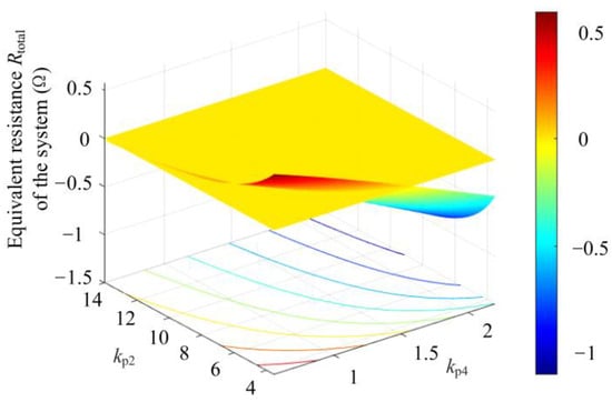 As shown in Figure 10 and Figure 11, the equivalent resistance of the system gradually decreases and even becomes negative as kp4 and kp2 increase. In a certain region, the equivalent resistance is less than 0, which indicates that the system may oscillate and become unstable when kp4 and kp2 take values within this region. Therefore, the region where the equivalent resistance is less than 0 is defined as an unstable domain, and the remaining region is defined as a stable domain. The range corresponding to the stable domain is the initial optimization range of kp4 and kp2.