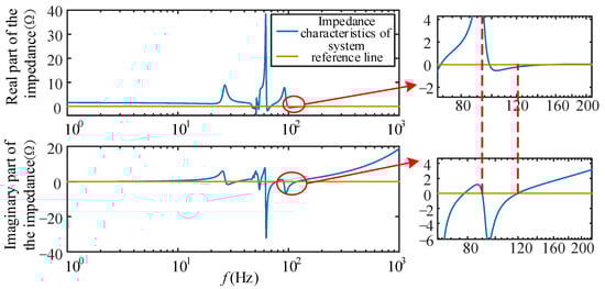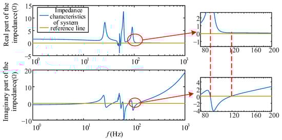 According to the negative-resistance effect [26], when the equivalent reactance of the system is equal to 0 and the corresponding equivalent resistance is greater than 0, the system is stable. The impedance characteristics of the system based on the negative-resistance effect under initial parameters is shown in Figure 12. It is illustrated in Figure 12 that the imaginary part of the system impedance is equal to 0, and the equivalent resistance of the system is less than 0 at 119 Hz. Therefore, there is an oscillation risk in the PV grid-connected system with a controllable nonlinear load at 119 Hz, which is consistent with the analysis results in Section 3. Moreover, In the range of 80–150 Hz, the equivalent resistance of the system has a minimum value Rmin, and its value is less than 0. There are two intersections between the equivalent reactance and the reference line, where the equivalent resistance corresponding to the first intersection is greater than 0 and the second equivalent resistance is less than 0. Negative resistance often appears at the second intersection. If Rmin > 0 in the range of 80–150 Hz, the equivalent resistances corresponding to the intersections of the equivalent inductance and the reference line are both positive. Therefore, Rmin can be used as a stability optimization indicator.