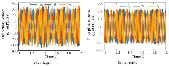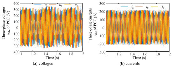 To verify the correctness of the stability analysis in Section 3, Lg is set to 0.003 H, and the remaining parameters are the same as those in Section 2, which will not be repeated here. At this time, the voltages and currents at the PCC of the system are shown in Figure 14. From Figure 14, it can be seen that there is a significant resonance in the voltages and currents at the PCC under the initial parameters. To analyze the resonant frequency of the voltages and currents, the single-phase voltage and current of PCC are collected for FFT, and the results are shown in Figure 15.