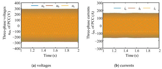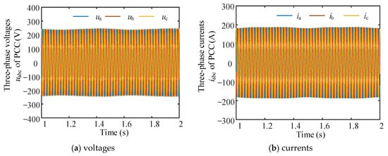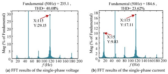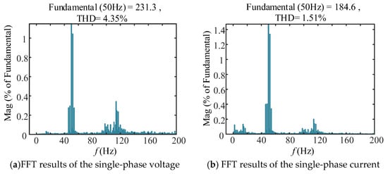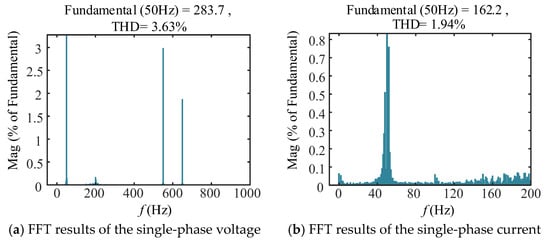 From Figure 25, it can be seen that the voltages and currents at the PCC can still remain stable when the equivalent inductance Lg becomes 0.001 H. At this time, the FFT analysis results of the single-phase voltage and current are shown in Figure 26. In Figure 26, the amplitude of the fundamental voltage at PCC is 283.7 V, and the total harmonic distortion (THD) of the voltage is 3.63%; the amplitude of the fundamental current at PCC is 162.2 A, and THD of the current is 1.94%.
