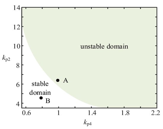 From the analysis in Section 4, it can be known that the range of values for key parameters is reduced when considering the interaction between parameters. To verify the correctness of the stability domain analysis, this subsection selects two sets of data, A and B, for simulation based on the conclusions of Section 4. The values of the parameter groups are shown in Table 3, and the location diagram is shown in Figure 16. The simulation results are shown in Figure 17 and Figure 18.