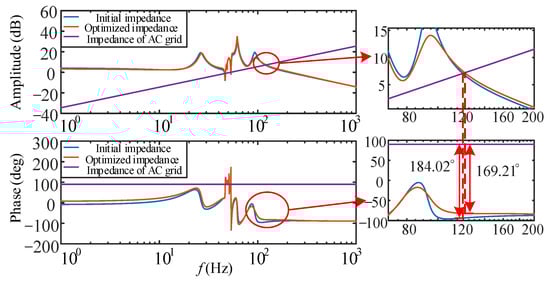 Using the optimized parameters of kp4 and kp2, the impedance characteristics of the system are shown by the orange curve in Figure 19. It can be known from Figure 19 that the phase difference at the intersection of the amplitude–frequency characteristics of the parallel subsystem and the grid before optimization is 184.02°, which is greater than the stable boundary 180°, indicating that the system is unstable. After optimizing kp4 and kp2, the phase difference is reduced to 169.21°, which is less than the stable boundary 180°, indicating system stability.