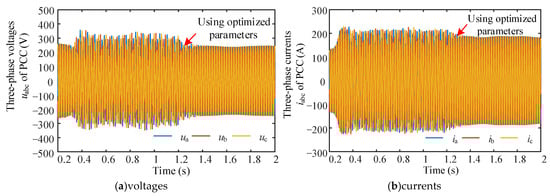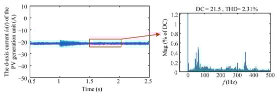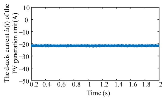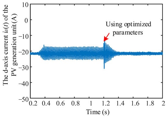 Figure 23 illustrates the d-axis current id(t) of the PV generation unit before and after optimizing the parameters. From the graph, it can be seen that in 0.3~1.2 s, the id(t) oscillates under the initial parameters. After 1.2 s, by optimizing kp4 and kp2, the id(t) is maintained at around −21.5 A (the negative sign represents the actual direction of the current being opposite to the reference direction), which meets the corresponding value of the power outer loop control.