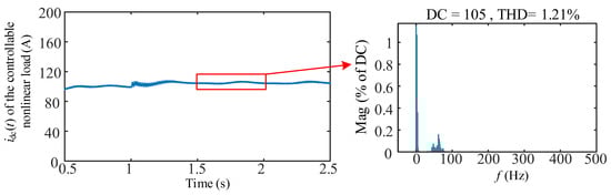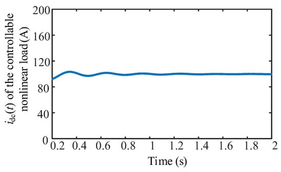 In addition to changes in the equivalent inductance Lg, the load level of the controllable nonlinear load may also fluctuate. Figure 29 and Figure 30 show the simulation results when idc_ref is changing from 100 A to 105 A at 1 s. From Figure 29 and Figure 30, it can be seen that after changing idc_ref to 105 A, the id(t) and the idc(t) can both recover stability after short-term fluctuations. Through FFT analysis of the stabilized signals, it can be concluded that the DC component of the id(t) is 21.5 A, and the DC component of idc(t) is 105 A, both operating near the set value, meeting the requirements.