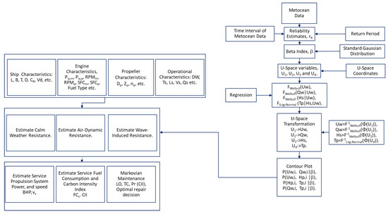Since each point on the hypersphere in the U-space is associated with the same reliability level when estimating , the points on the hypersphere in the X-space can be systematically checked until the most significant derived BHP, generated CO2, consumed fuel, ship speed, and attained CII is encountered. The conversion from the standard normal distribution in the U-space to a physical random variable in the X-space is made using the Rosenblatt transformation [46].