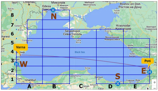 The Black Sea’s surface is divided into zones that cover specific geographic areas where the wave conditions are assumed to be uniform [15] (see Figure 2). These zones have approximate dimensions of 237 × 79 km (3:1) and are designed to accommodate the main traffic directions of S–N, S–N.E., and vice versa.