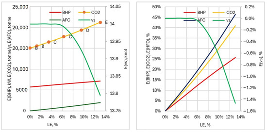 Using the applied load definitions in the case of a propulsion system that progressively is losing its efficiency, an annual probability of exceedance of 10−4 of the environmental condition is assigned to the analysis of BHP, generated CO2, consumed fuel, ship speed, or attained CII.