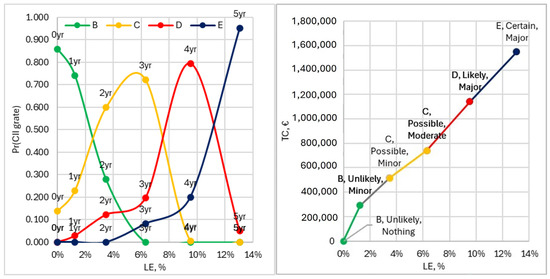 Probability of CII grates, maintenance decisions and associated cost as a function of LE.