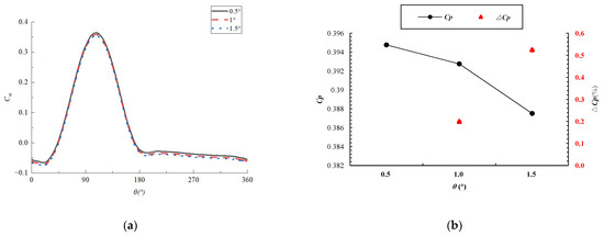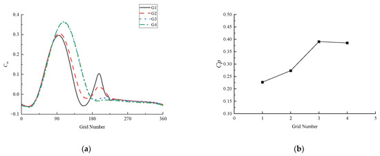In the above formulae, is the error calculated using different grids, = f2 − f1, f1, and f2 are the solutions of the fine grid and coarse grid, respectively, f can be any quantity of concern; here, it is taken as Cp; Fs is safety; the coefficient is 1.25; r is the grid density ratio, which is ; p is the accuracy level; according to the second-order discrete method, p = 2; and u2,i − u1,i are the moment coefficients Cm of the ith step of the fine mesh and coarse mesh, respectively.