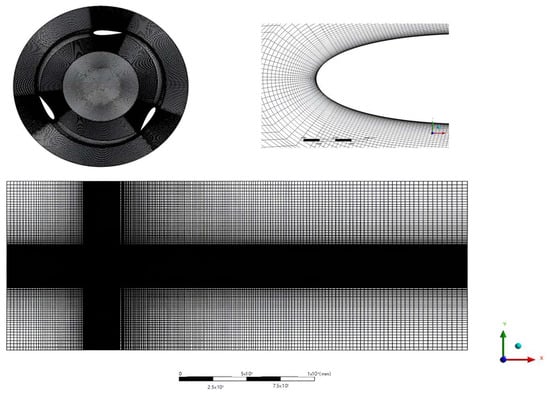 This study uses the computational fluid dynamics solver “Ansys Fluent” software to calculate specific problems using the finite control volume method. The (SST ) turbulence model was chosen because it shows better performance in terms of stability and reliability and has the best consistency with experiments utilizing the Reynolds-averaged Navier–Stokes equation as the foundation. The Mach number in all numerical experiments was maintained below 0.3, and the airflow was treated as incompressible []. Therefore, the SIMPLE algorithm was chosen to couple the pressure–velocity equation and the SST turbulence model. The air density was set at 1.225 kg/m3, the viscosity was set at 1.79 × 10−5 Pa.s, the inlet speed was established at 5 m/s, and the pressure outlet was maintained at 0 Pa. The time discretization utilized the second-order implicit technique, with a convergence iteration residual set to 10−5. A computation spanning 10 revolutions was executed, and the power coefficient (Cp) was determined based on the thrust coefficient (Cm) observed in the last 2 cycles. A large number of studies by scholars have shown that the calculation results of the last two laps converge well [].