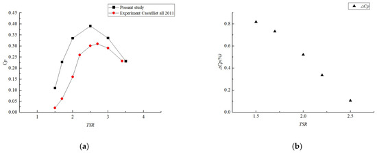 (a) Comparison of experimental and simulated Cp-TSR curves []. (b) Comparison of experimental and simulated ∆Cp-TSR curves.