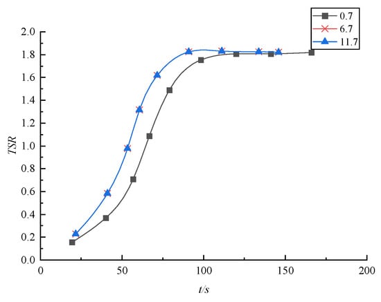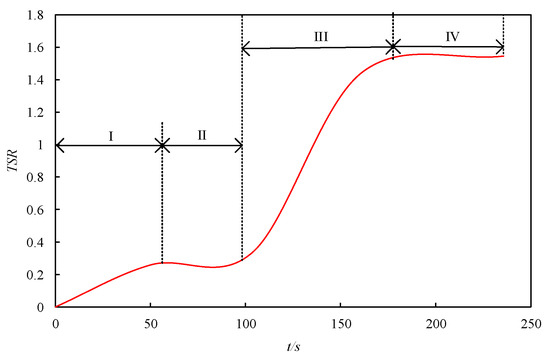 This section investigates the rotational speed during the turbine startup and the torque coefficient when VAWTs are static. From the standpoint of wind energy utilization, the wind turbine attains optimal efficiency in wind energy utilization when the rated TSR is reached, indicating that the startup is successfully accomplished. In accordance with Hill et al. [], the startup process can be delineated into four stages, as illustrated in Figure 8: During the first stage, the turbine speed undergoes an approximately linear acceleration attributed to drag; in the second stage, the TSR attains a plateau, where the speed experiences minimal increase; in the third stage, the TSR undergoes a rapid increase through lift-driven motion; and in the fourth stage, it reaches its zenith, marking a balanced operational state.