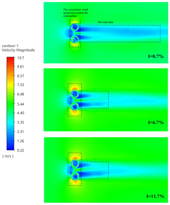 Sun S Y [] conducted wind tunnel experiments with different turbulence intensities of 0.7%, 6.7%, and 11.7%. This study conducted simulations under the same turbulence intensity to evaluate whether CFD can capture the same behavior. The same turbulence intensity was chosen in this study in order to compare the experimental results with simulation simulations. Turbulence intensity plays a crucial role in determining the performance Cp of a wind turbine and stands as a pivotal factor influencing its efficiency. Variations in turbulence intensity directly impact the local wind speed distribution characteristics, consequently affecting the magnitude of the Cp. The Cp data of wind turbines under different turbulence intensities are shown in Figure 12. The simulation results exhibit a similar trend as the experimental data, indicating an increase in the power coefficient with rising turbulence intensity within a specific range of tip speed ratios. This consistency between the simulated and experimental outcomes not only validates the reliability of the simulation model but also demonstrates the significant impact of turbulence intensity on the power output of the wind turbine. The increment in turbulence intensity is correlated with a progressively intricate and turbulent flow field structure, as evident in the turbulence cloud diagram presented in Figure 13. In conditions of low turbulence intensity, the flow field exhibits a relatively stable state, and the turbulent structure manifests a uniform distribution. Conversely, with an escalation in turbulence intensity, the turbulence cloud image depicts finer-scale and high-frequency changes, indicative of a more tumultuous and irregular evolution of turbulent motion within the flow field. As shown in the dotted circle and solid rectangular box in Figure 13, the development of these turbulent structures directly influences the aerodynamic performance of VAWTs. Under conditions of relatively low turbulence intensity, wind turbines operate within a relatively stable airflow, resulting in a more uniform distribution of aerodynamic loads on their blades []. Nevertheless, with the escalation in turbulence intensity, the non-uniformity within the turbulence induces an asymmetrical distribution of loads on the wind turbine blades. This turbulence stimulates the boundary layer of the blades and hinders flow separation on the suction side, consequently postponing the onset of dynamic stall. Although this may lead to increased dynamic oscillations of the blades, it concurrently generates a higher power output from the wind turbine.