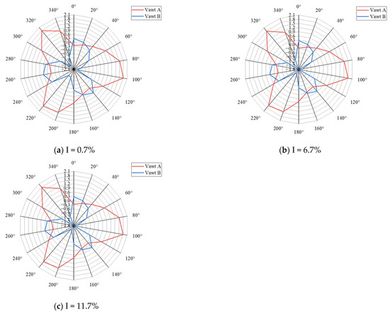 An elevation in turbulence intensity implies a more intricate turbulent structure, indicative of a heightened non-uniform motion of gas molecules, consequently intensifying aerodynamic uncertainty. This heightened uncertainty may subject the wind turbine to increased disturbances, but it also endows it with additional kinetic energy []. Hence, even though the blades experience more intricate aerodynamic loads, the wind turbine as a whole may demonstrate an elevated power output. It is imperative to note that while heightened turbulence intensity may enhance power output, it also introduces challenges in terms of system dynamics. The operation of wind turbines in environments with high turbulence intensity introduces complexity and necessitates advanced control strategies to ensure system stability. Consequently, heightened turbulence intensity represents both a potential opportunity and a challenge that demands careful consideration and management in the design and operation of VAWTs [].