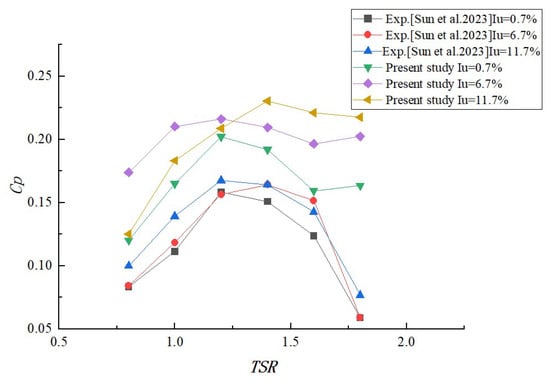 In conclusion, this study offers a thorough and comprehensive insight into the aerodynamic performance of VAWTs in turbulent environments. This paper employs a two-dimensional numerical analysis method, which simplifies the complexity of the flow field to some extent. While the 2D model offers advantages in computational efficiency, it may not fully capture certain three-dimensional flow characteristics, such as vortices and the three-dimensional effects of fluid flow. While our simulation results are consistent with experimental data in terms of overall trends, the accuracy of the model is dependent on specific experimental conditions and assumptions. Future work may require additional experimental data to further validate and refine the model, particularly under different environmental conditions and turbine designs.