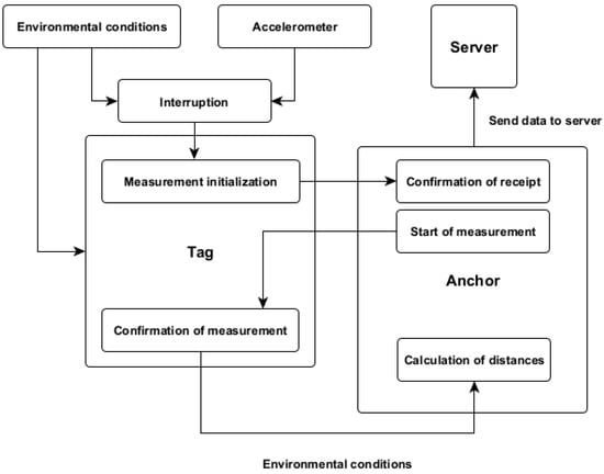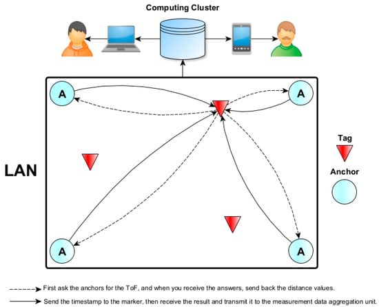 The implementation presented, is designed for goods positioning systems in warehouse management. It uses temporal analysis techniques such as ToF (Time of Flight) in combination with UWB (Ultra-WideBand) transmitter technology, whose hallmarks are exceptional accuracy in determining the distance between two devices and resistance to interference compared to transmission analysis methods [4,5]. The motivation for addressing the topic was the rapidly growing segment of UWB devices, the proliferation of which in recent years has enabled their successive implementation of this technology in an increasing number of systems. Nevertheless, its potential remains untapped in terms of location accuracy (single centimetres) or general compatibility with other types of systems. Existing devices on the market today are often designed to operate within the device pool of a single manufacturer and base their functionality solely on the radio layer. The development of the device and its combination with various machine learning algorithms was intended not only to improve the accuracy of the location, but also the complementarity of the functions performed in relation to the large-scale warehouse management market. In addition, the entire hardware layer produced was designed and manufactured in-house using as many elementary/fundamental solutions as possible. This provided the opportunity to look for a hardware layer, every aspect of which could be tailored to a specific industry. The established device network includes two proprietary hardware solutions. One is the equivalent of a UWB tag in the system, while the other is a UWB anchor. For the system to detect and track an object, the network requires a set of at least one tag and three anchors [6,7]. As the number of tags increases, the load on the system increases. When the number of anchors increases, this usually involves expanding the area covered by the observation and improving the accuracy of the marker location [8]. The equipment set up in this way can orient objects in space. At precise moments, the tags force the anchors to interact by exchanging communication packets containing time stamps. Based on these, the devices can calculate the distance separating them [9]. The distance information is returned to the anchors, which have a permanent and direct connection to the building’s local network. In this way, the information acquired by the devices is fed into the computing cluster and processed by proprietary algorithms. The Cartesian coordinates of the objects are returned, which are applied in real-time to the 3D visualization of the building. The described methodology of operation is shown symbolically in Figure 1. A detailed block diagram of the operation of the marker-anchor pair is presented in Figure 2.