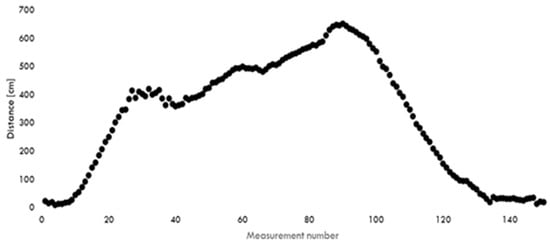 where d is the distance between device A and B, c is the speed of light for the particular case of the medium in which it propagates, while t1 and t2 are the time stamps, with t1 being the start of the measurement and t2 its end. The resulting distance is the first and basic starting information for the computational algorithms and machine learning mechanisms based on which the object will be located. The more such reference points the system obtains in relation to a specific marker, the smaller the uncertainty resulting from the current location will be. However, the readings must result from devices correctly calibrated in terms of hardware and software [32]. To improve subsequent analysis on cases consisting of multiple readings for each device, the variation of the signal over time was tracked and presented itself as shown in Figure 5 and Figure 6. The graph in Figure 5 shows the variation of the measured distance information returned by the marker and anchor as a function of the measurement number for an object in motion. The graph in Figure 6 was made for a non-moving object. This checked the variance of the received results.