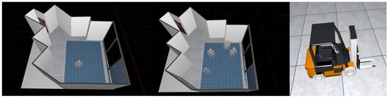 To perform more complex tests, a real test environment was prepared in which the equipment was installed. This was done by choosing a room with a complex shape to gradually increase the model’s complexity and assess the impact of architectural obstacles on the performance of the designed devices. Testing of the prototypes were conducted with the largest possible area, a 5 m × 4 m rectangle. Models showing the entire room and the object models used are shown in Figure 7.