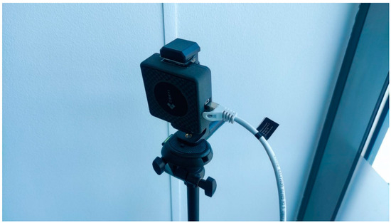 Tripods set at a height of 120 cm were used to position the anchors in the room. This took into account the significant effect of the human body on the propagation speed of the electromagnetic wave in the room. This is due to the high water content of the human body. This height is due to the concentration of matter at this height (waist to mid-torso) for an average human height. In the context of transmission methods, water can be a hard barrier to EM waves. However, in the case under consideration (a time-distance measurement method), there are multiple changes in wave speed when passing through an obstacle, which is a strongly heterogeneous mixture of matter. The radiated wave may then undergo partial transition, refraction, or reflection, which considerably impacts the final measurement result. The same applies to tracking objects through other objects or walls with different intensities. A reference point consisting of an anchor and tripod in the given configuration is shown in Figure 8. The anchor prototype has been fitted with a dedicated enclosure (as has the marker), and on the right side of the anchor, you can see the power supply using a twisted-pair Ethernet cable with an RJ-45 connector and a PoE power supply.