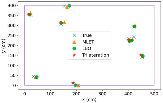 Beyond mere precision, the pivotal advantage of the newly proposed algorithms lies in their robustness. The inherent limitation of trilateration, notably its inability to provide solutions in the presence of significant measurement noise, is vividly illustrated in Figure 10. In this depiction, only 5 out of 9 results exhibit a trilateration solution. In stark contrast, MLET and LBO consistently deliver solutions for every sample in our dataset, highlighting their robust nature. This robust performance is of utmost importance, especially in practical applications like the production environment, where the inability to ascertain the transmitter’s position can have severe consequences.