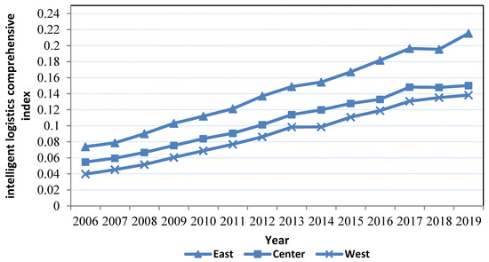Average comprehensive intelligent logistics index in East, Central and West China (2006–2019).