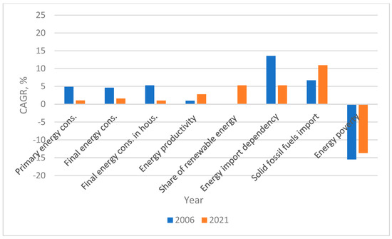 Table 2 presents the average CAGR value determined in the years 2005–2022, with 2005 taken as the base year. It should be noted that for most variables, the indicator has a value greater than 1 (Figure 1). The highest CAGR value occurs in the case of dependence on energy imports. This shows the increasing level of dependence on coal imported from abroad, until recently, mainly from Russia. The final energy consumption in households per capita is growing the slowest. In the case of the population unable to keep their homes adequately warm by the poverty status variable, the measure indicates a dynamic decline.