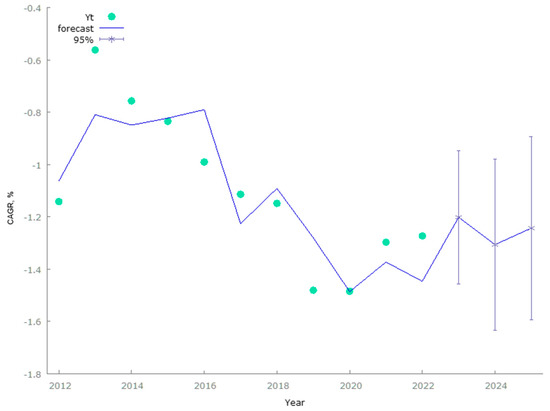 Therefore, the model was successfully verified and validated and used for forecasting. Figure 2 shows the time series of actual and theoretical values with a forecast until 2025. The forecast indicates that in the next 3 years, the value of the explained variable will not undergo significant changes. The CAGR value for the explained variable still indicates a decline, which in 2025 compared to the last known observation (2022) changed by 3%.