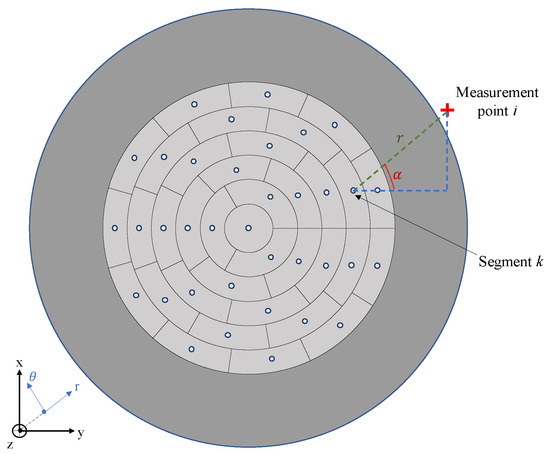 It is necessary to measure the magnetic field at regular intervals, specifically to measure both the radial component, and the tangential component, . The calculation of magnetic field components at measurement points i relies on the function of unknown currents Ik with . Hence, the various components are given by