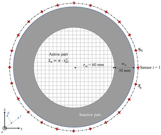 The stack is divided into 36 segments, , as depicted in Figure 2, with each segment maintaining an identical cross-sectional area. The magnetic field measurements are taken using micro-Hall effect sensors, with Figure 3 indicating positions, potentially corresponding to 24 sensor locations (viz., to with ) arranged every 15° around the considered electrolyzer. The choice of 24 sensors was made to achieve significant discretization, which could directly impact the quality of the current density reconstruction.