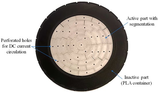 The active part is composed of multiple segments of the same cross-section, which are isolated from each other by a Kapton of 0.02 mm. The complete disposition of the segments permits us to obtain a total active surface with a circular form. Every segment is pierced but not holed in order to introduce a banana plug and reproduce current density distributions. Consequently, the conductive segments are supplied by DC currents. A picture of the developed experimental magnetic electrolyzer emulator (an essential element of the bench) is shown in Figure 4. The central active region is encircled by a non-magnetic area with a width of 3 cm (black frame in Figure 4), fabricated using a 3-D print in polylactic acid (PLA).