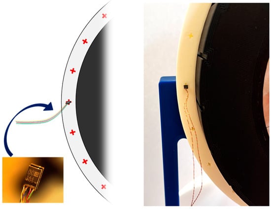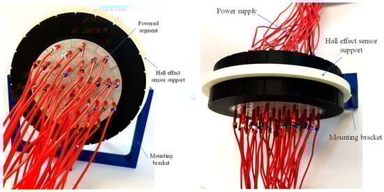 One of the primary objectives is to measure the magnetic field produced by the electrolyzer emulator in relation to the current injected into the conductive segments. To facilitate this, a non-magnetic support, 3-D printed in white PLA (as shown in Figure 5), is used for mounting the micro-Hall effect sensors. Both the radial and tangential components of the magnetic field are measured at consistent intervals around the electrolyzer emulator.