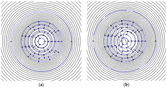 In Figure 8b, the equipotential lines of the electrolyzer are depicted, showing a failure affecting one-sixteenth of its surface area, as illustrated in Figure 7b. A distortion of the circular equipotential lines, as observed earlier, is evident. Particularly in the central regions of the electrolyzer, the equipotential lines exhibit a bean-like shape, which perfectly aligns with the representation of the fault being examined. Such a deformation is characteristic of a device experiencing non-uniform current densities.
