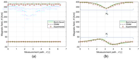 In this section, we compare the analytical results with both experimental and numerical data. Various operating conditions, including normal and abnormal scenarios, are illustrated in Figure 7. Magnetic field components, specifically radial and tangential were recorded at 15° intervals, resulting in 24 experimental measurement points around the electrolyzer emulator, as depicted in Figure 3.