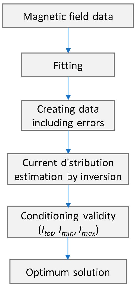 As indicated in Section 2 on the 2-D Biot–Savart model, it is feasible to reconstruct the current density distribution by analyzing the magnetic field generated around the electrolyzer. This requires addressing the inverse problem, which entails employing an algorithm to minimize errors and reconstruct the current density flowing within the electrolyzer. The algorithm involves several steps for data manipulation, as illustrated in Figure 10. These steps are meticulously designed to facilitate the accurate reconstruction of the current density distribution based on the magnetic field data obtained from the electrolyzer.
