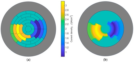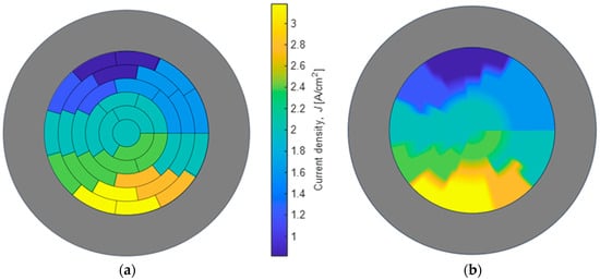 Several factors, such as temperature [,], reactant humidity, non-uniform gas production, and the configuration of the flow field, combined with the characteristics of the membrane electrode assembly (MEA), could potentially lead to a non-uniform current density distribution []. The performance of an electrolyzer is affected when the current distribution is non-uniform. The current density is a parameter particularly studied in the literature [,,].