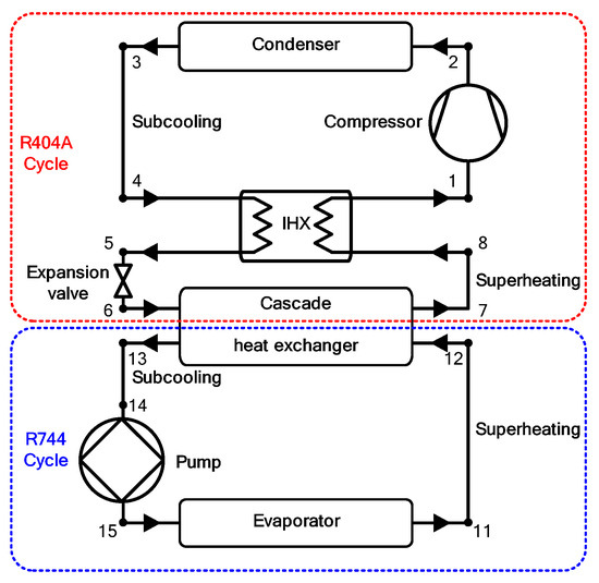 Despite numerous studies on the IRS (Table 2), the IRS with R404A as the primary refrigerant and R744 as the secondary fluid has not been extensively investigated. In addition, in the few cases where an internal heat exchanger (IHX) has been applied, simple comparisons have been made between systems with and without an IHX, and no extensive studies have been conducted for different efficiencies of the IHX, which improves the performance of refrigeration systems. Moreover, to the best of our knowledge, analyses of exergy on the refrigeration system with an IHX are lacking. Therefore, in this study, exergy was analyzed according to the degree of subcooling (DSB) and degree of superheating (DSP) of the R404A cycle, DSP of the R744 cycle, condensing temperature (CT), cascade evaporating temperature (CET), and IHX efficiency under constant conditions to identify the exergy characteristics of a low-temperature (−35 to 5 °C) R404A IRS using an IHX and R744 as the secondary fluid. This study aims to provide basic data for the optimal design of a low-temperature (−35 to 5 °C) R404A IRS using an IHX and R744 as the secondary fluid.