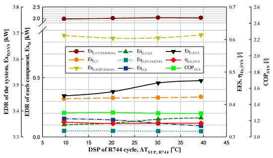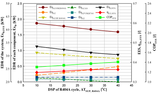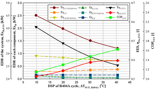 Figure 4 shows the experimental data on the EDR of each component, EDR of the system, EES, and COP of the system according to the DSP of the R404A cycle in the IRS. Figure 10 shows the results obtained via performance analysis.