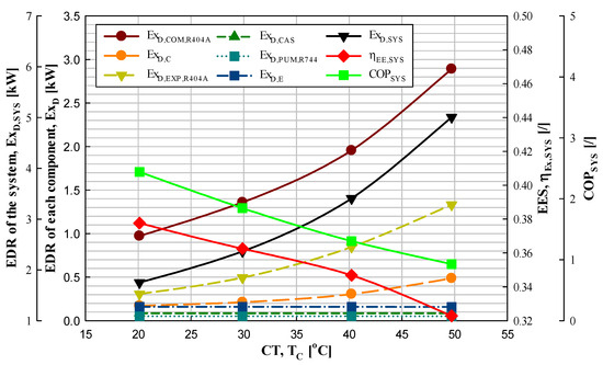 As the CT increased from 20.1 to 49.7 °C (in approximately 10 °C increments), the EDR of the system increased by 35–47%, whereas the EES decreased by 4–6.9%. The variation in the COP of the system was similar to that of the EES. The changes in the EDRs of the pump and evaporator in the R744 cycle were negligible because the MFR, ET, CT, DSP, and DSB of the cycle remained constant. The EDRs of the condenser, compressor, and EV in the R404A cycle increased by 39.8–47.8%, 23.9–56.3%, and 57.3–71.1%, respectively.