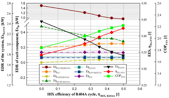 Therefore, high IHX efficiency in the R404A IRS can increase the COP and exergy of the system by decreasing the EDR of the system.