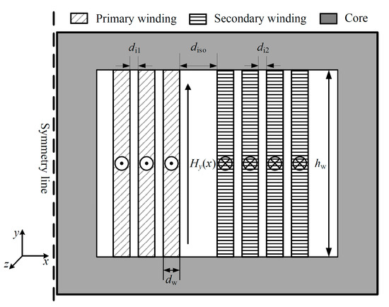 The losses in copper foil windings are primarily AC resistance losses, which entail solving a three-dimensional electromagnetic field problem within the transformer [34]. This scenario is highly complex, making it challenging to use analytical methods. To facilitate the calculations, the three-dimensional model is simplified to an ideal two-dimensional model, as shown in Figure 2, for analysis.