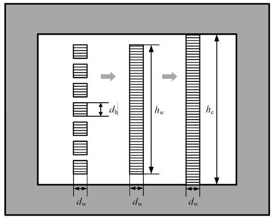 In practice, the height of the copper foil winding often varies with respect to the height of the core window. Additionally, other types of windings cannot be directly calculated using the above method. To equate the winding height to the core window height, the porosity factor algorithm is used to convert the winding equivalently. As shown in Figure 4, the winding on the far left is a segmented conductor, the height of each conductor segment is . Using the porosity factor , the winding can be converted into a copper foil winding with the same geometric height (as shown in the middle winding in Figure 4). Then, using the porosity factor , the winding can be further converted into a copper foil winding with a height equal to the core window height (as shown in the far-right winding in Figure 4, and its height is ).