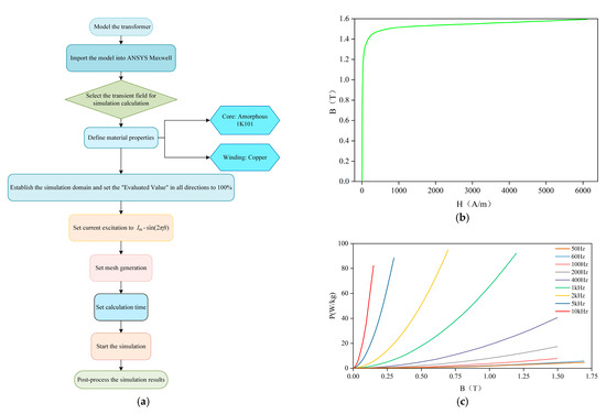 Detailed description of the finite element simulation. (a) Simulation process flowchart; (b) B-H curve of the amorphous material 1K101; (c) B-P curves of the amorphous material 1K101 at various frequencies.