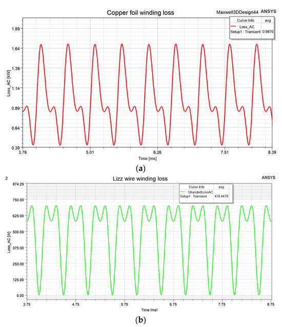 One-quarter of the prototype’s winding loss simulation waveforms. (a) Copper foil winding loss waveform. (b) Litz wire winding loss waveform.
