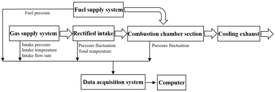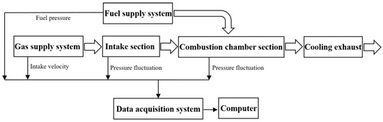 Intake pressure pulsations, combustion chamber pressure pulsations, and fuel pressure pulsations are measured using dynamic pressure sensors, model PCB 113B28(PCB Piezotronics, New York, NY, USA), with a sensitivity of 15 mV/kPa, a range of 34.47 kPa, and an uncertainty of ≤0.3%F.S. The fluctuation in the heat release rate can be used to determine the combustion status, which is indirectly measured by measuring the CH* chemiluminescence intensity of the flame [20]. In this paper, a bandpass filter at 435 nm ± 5 nm combined with a Hamamatsu Photonics CH348 photomultiplier tube is employed to capture the CH* chemiluminescence signals. All the above dynamic signals are connected to an NI multichannel data acquisition system for synchronous acquisition.