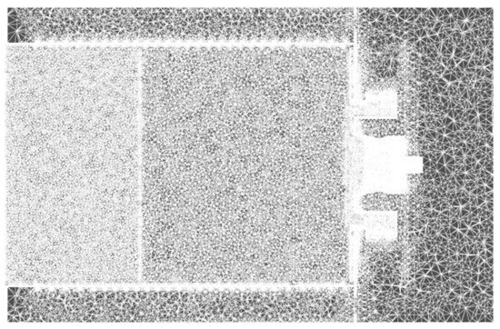 In our study, grid division was completed using ICEM. For the two different swirl models, we adopted different grid strategies to accommodate their respective geometric features and flow characteristics. For the central staged swirl combustor, as shown in Figure 5, due to the complex swirl structure at the head, we chose unstructured grids to mesh the geometry, ensuring good grid quality, with a total grid number of 14 million. The numerical simulation employs Large Eddy Simulation (LES) for the turbulence model and a non-premixed combustion model, using the Discrete Phase Model (DPM) to simulate the breakup and evaporation process of RP-3 kerosene in the combustor as a gas–liquid two-phase phenomenon. This paper adopts the SIMPLE algorithm to solve for the velocity field and pressure field. The computational modeling is based upon an in-house CFD code known as the general equation and mesh solver [22]. The Navier–Stokes equations along with a single energy equation and five species equations are solved numerically. The LES turbulence model is used to compute large eddies directly. The Subgrid-Scale model used in this study is the Smagorinsky–Lilly model. The scheme is second-order-accurate in time. A physical time step of 5 × 10−5 s is used for all simulations. Simulations are started from quiescent conditions at atmospheric pressure and a temperature of 426 K. At the beginning of the simulation, both the fuel and oxidizer enter the combustor simultaneously, exposing the combustor to the incoming propellant and atmospheric backpressure. The entrance boundary condition of the combustor is a mass flow rate inlet, with an airflow rate of 100.2 g/s, a temperature of 426 K, operating at atmospheric pressure, and a total fuel flow rate of 5.71 g/s (FAR = 0.057). The convergence criterion is set with a computational residual of less than 0.001 as the standard.
