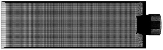 For the swirl model combustor, as shown in Figure 6, the head’s single-stage swirler remains complex, but the rear half of the combustor is merely a simple rectangular structure, so a mixed grid of unstructured and structured elements was used, with a total grid number of 4 million. The numerical simulation also employs Large Eddy Simulation for the turbulence model, with the combustion model being a partially premixed FGM (Finite-Rate Gaseous Mixture) model [23] to numerically simulate gaseous fuel propane. The solution algorithm and discretization accuracy are the same as those set for the centrally swirler stage combustor, and the boundary conditions are set to be the same as those described in Section 2.2.3 for the experimental conditions.